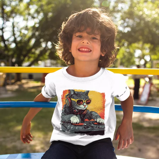 Cool DJ Cat Kids’ Cotton T-Shirt – Trendy Cat Graphic Short Sleeve Tee – Music 90s T-Shirt for Kids