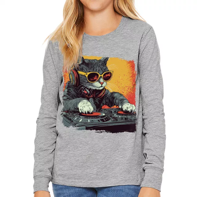 Cool DJ Cat Kids’ Long Sleeve T-Shirt – Music 90s T-Shirt for Kids – Trendy Cat Graphic Tee for Boys Girls