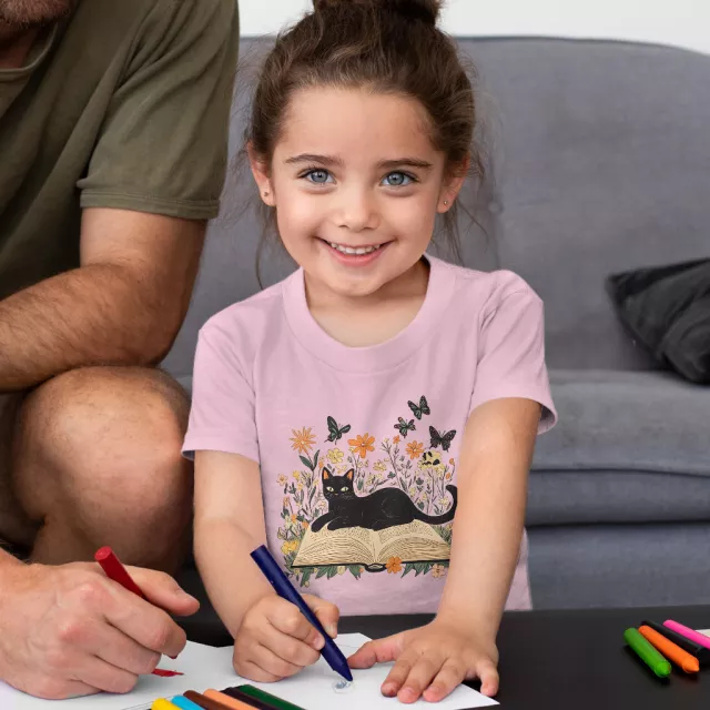Floral Cat Toddler Cotton T-Shirt – Cat Book Short Sleeve Tee – Cute Cat T-Shirt for Kids