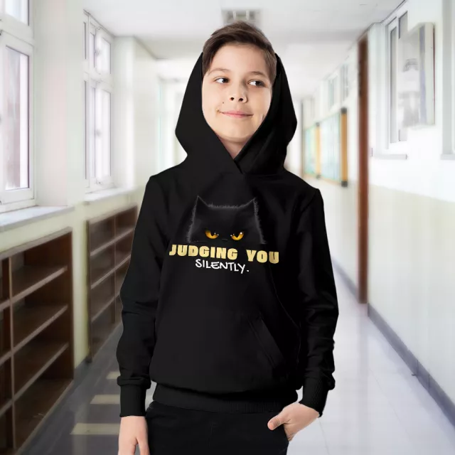 Judging You Silently Kids’ Hoodie – Cute Kitty Hooded Sweatshirt – Black Cat Hoodie for Kids